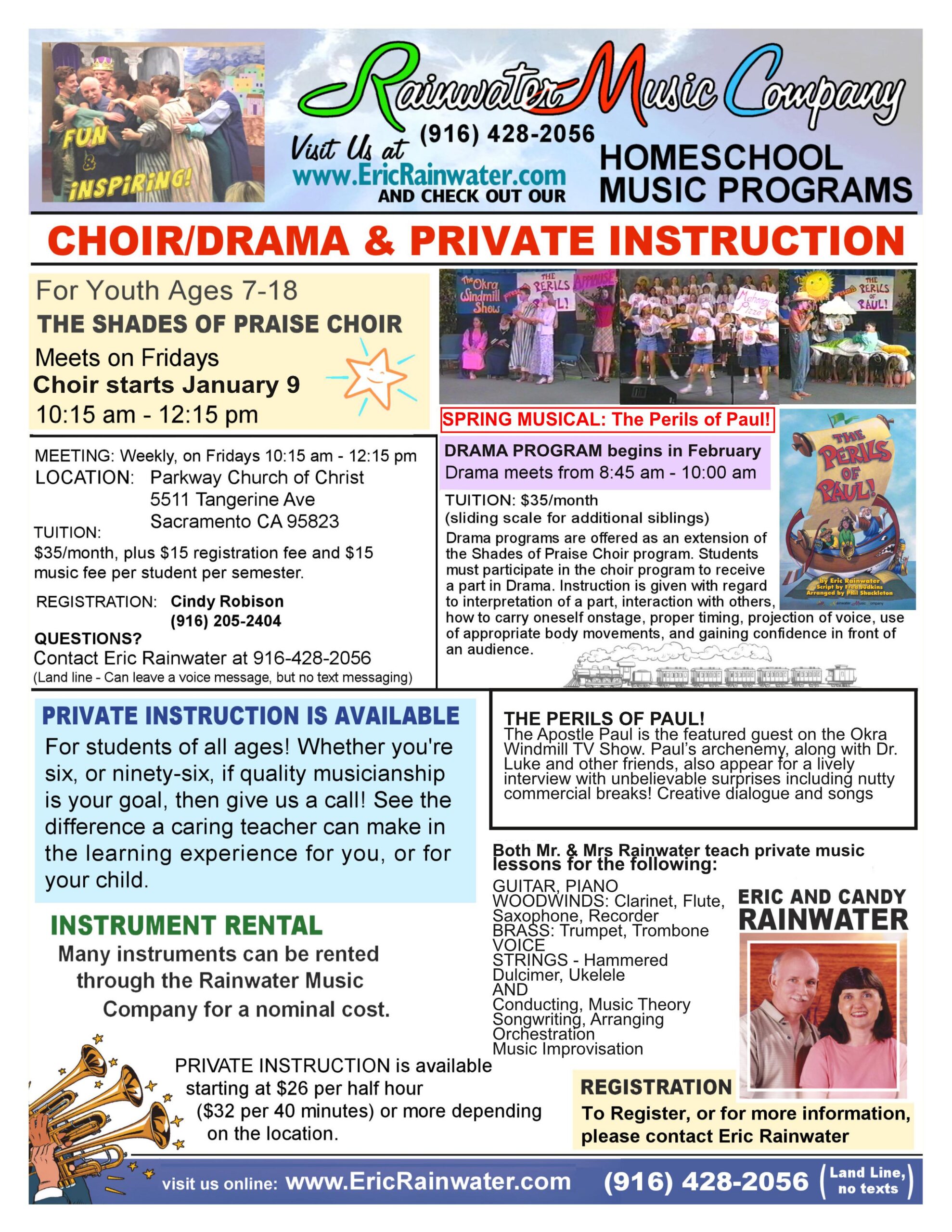 Reconnect with that old instrument, or learn a new one, or pursue musical mastery! The Rainwaters can help you with the following: